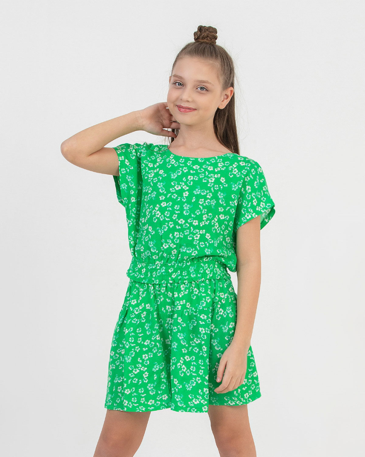 Костюм детский летний из штапеля с топом и шортами просто обязан быть в гардеробе каждой модницы. Юбка-шорты с комфортной посадкой и поясом на резинке. Топ свободного кроя на манжете, линия плеча спущенная, застегивается на пуговицы.