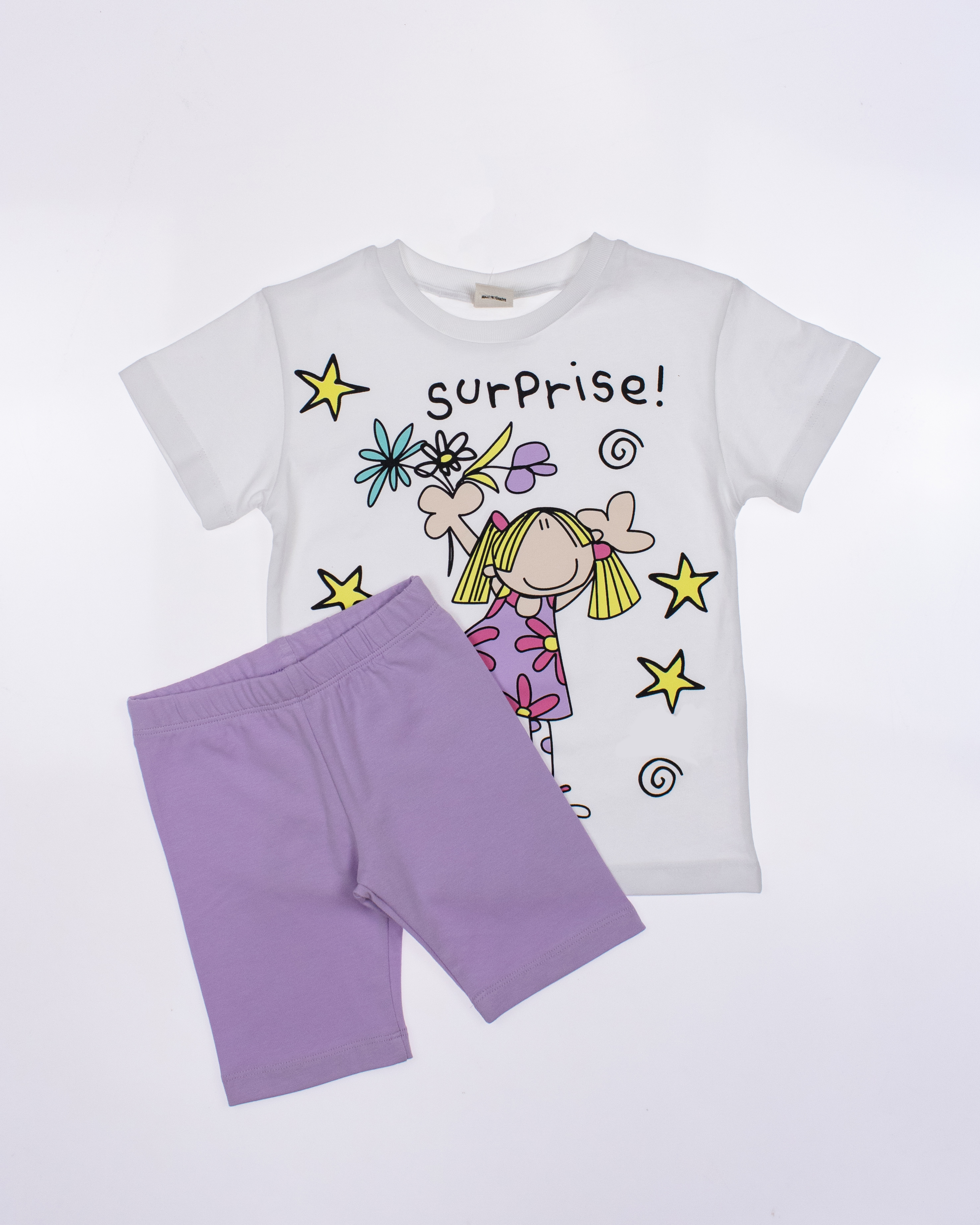 Детский костюм торговой марки DMB - это отличный выбор для маленькой модницы! Произведенный в Турции из высококачественного трикотажа кулирка, этот костюм обеспечивает комфорт и удобство на целый день. Свободный крой и разрезы по бокам делают эту футболку стильной и современной.  А принт на передней части футболки придает ей яркость и оригинальность. Этот костюм подойдет как для повседневной носки, так и для активного отдыха на свежем воздухе. А оптовая цена делает его отличным выбором для магазинов и интернет-магазинов детской одежды. Порадуйте своих малышей качественной и стильной одеждой от DMB !