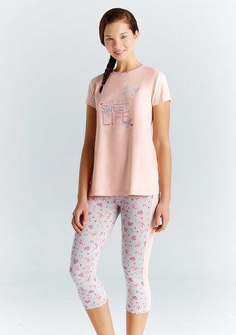 Cтильная пижама для девочки сделана из натурального дышащего материала. Популярная модель от турецкого бренда Baykar дополнена принтом и набивным рисунком. Классическая футболка с коротким рукавом и высокой горловиной имеет форму трапеции. Бриджи с контрастными лампасами плотно прилегают к телу, не мешают движениям.