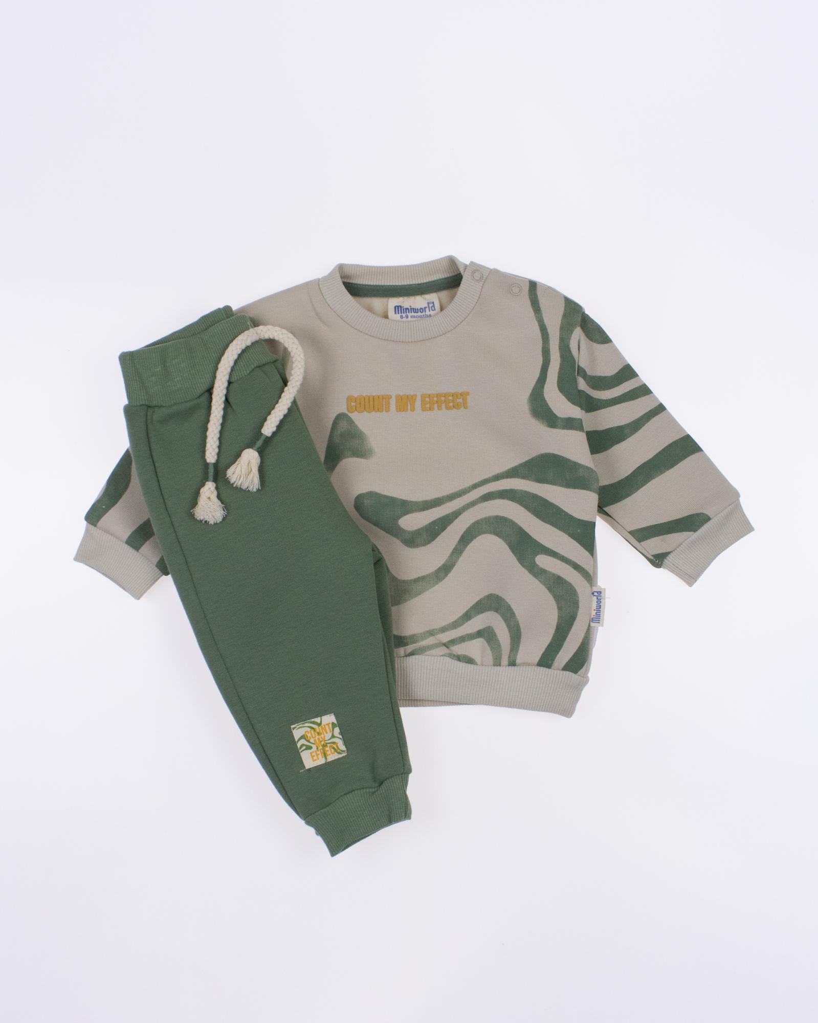 Мы предлагаем оптовые продажи детской одежды производства Турция. Хлопковый костюм  MINIWORLD выполнен из  хлопка с начесом , что гарантирует комфорт и безопасность для самых маленьких детей. Свитшот имеет удобную застежку-кнопки на плече, что облегчит процесс надевания и снятия одежды. Штанишки с мягкими манжетами на эластичном поясе идеально подходят для ношения с подгузником, обеспечивая свободу движений и комфорт. Детский милый принт на костюме поможет развить фантазию и воображение ребенка, делая его образ ярким и запоминающимся. Костюм MINIWORLD - отличный выбор для маленьких модников и их заботливых родителей. Не упустите возможность приобрести этот уникальный товар оптом по выгодной цене!